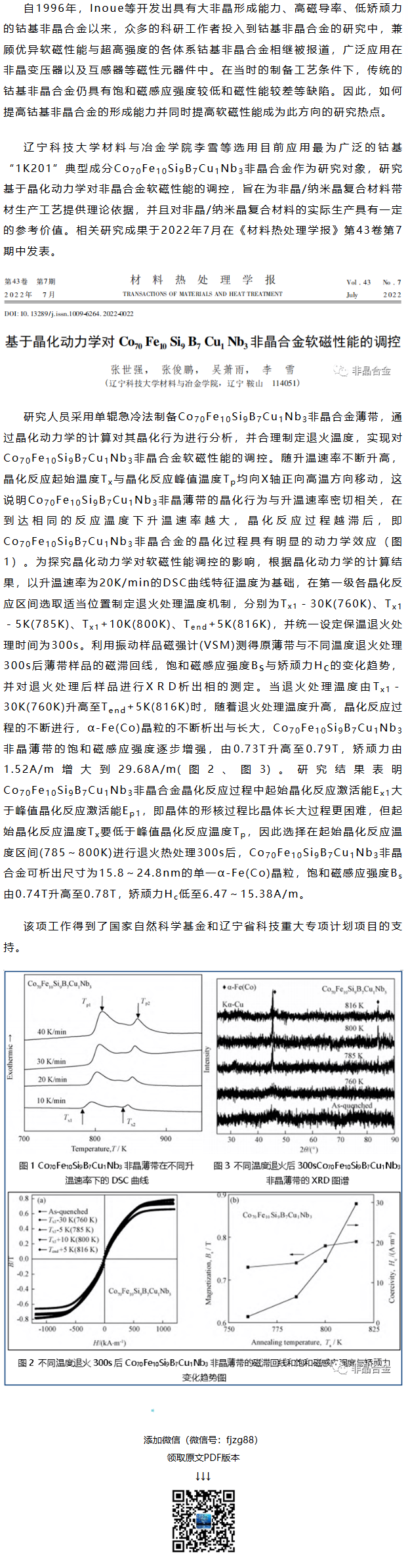 《材料热处理学报》李雪等工作:基于晶化动力学对Co70Fe10Si9B7Cu1Nb3非晶合金软磁性能的调控