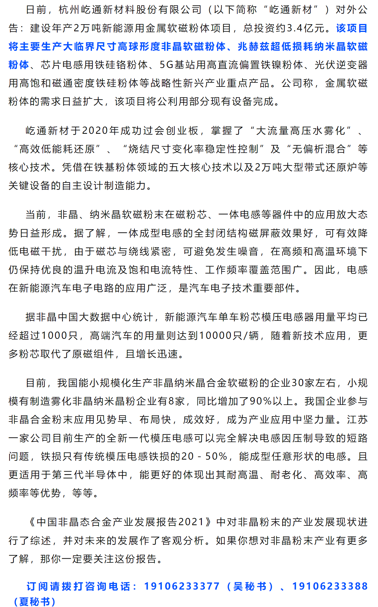 屹通新材:投资生产大临界尺寸高球形度非晶、兆赫兹超低损耗纳米晶软磁等粉体项目