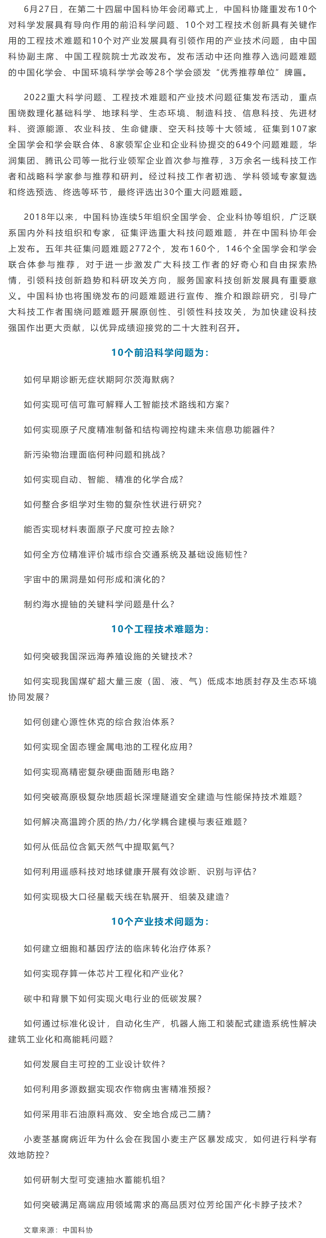 30个!中国科协发布2022重大科学问题、工程技术难题和产业技术问题