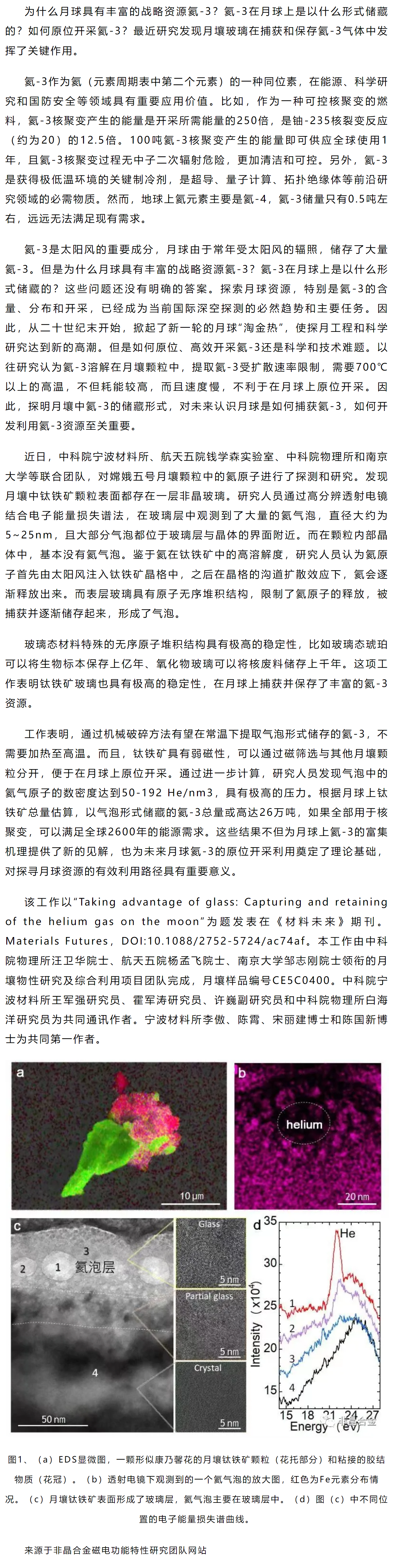 《Materials Futures》王军强等工作:月壤玻璃,捕获和保存氦-3气体的关键物质