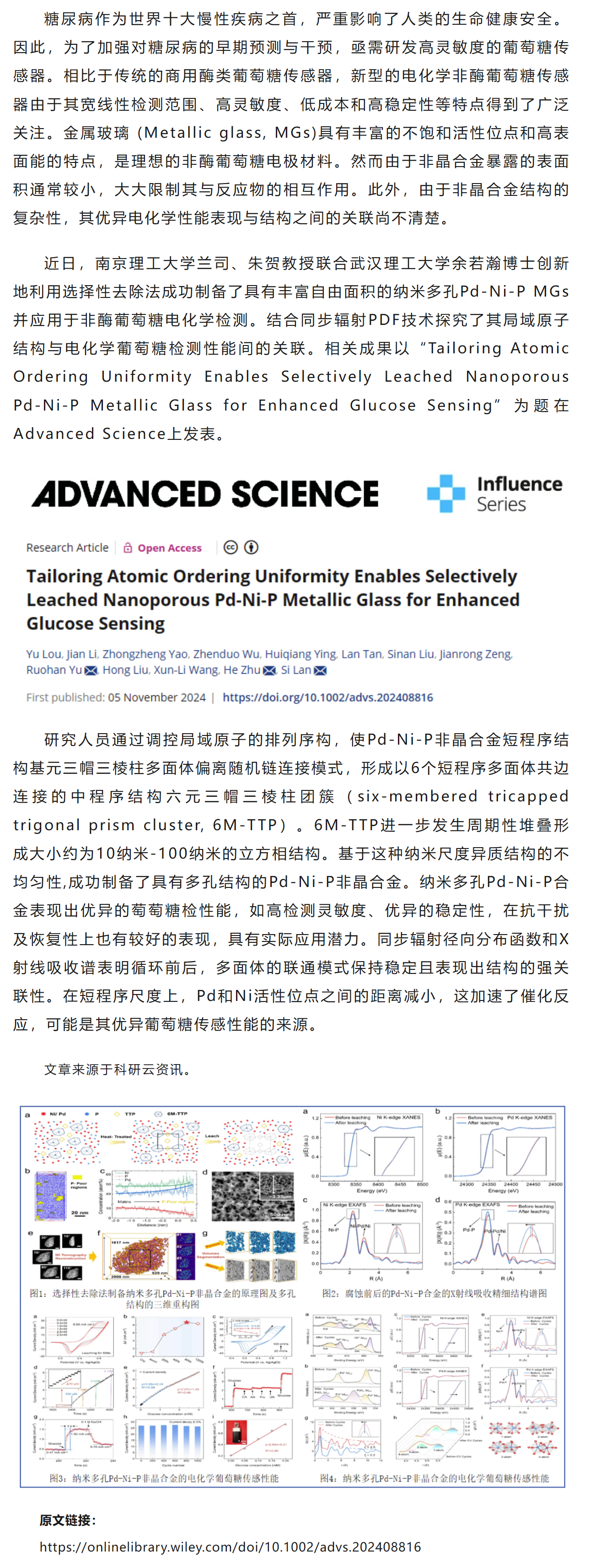 南京理工大学Adv. Sci.:通过调控原子有序结构实现纳米多孔Pd-Ni-P金属玻璃的制备以提高葡萄糖传感性能