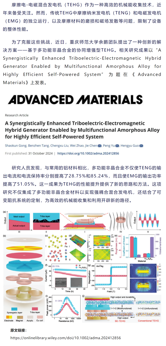 《Advanced Materials》重庆师范大学余鹏等工作:基于多功能非晶合金的协同增强型摩擦电-电磁混合发电机