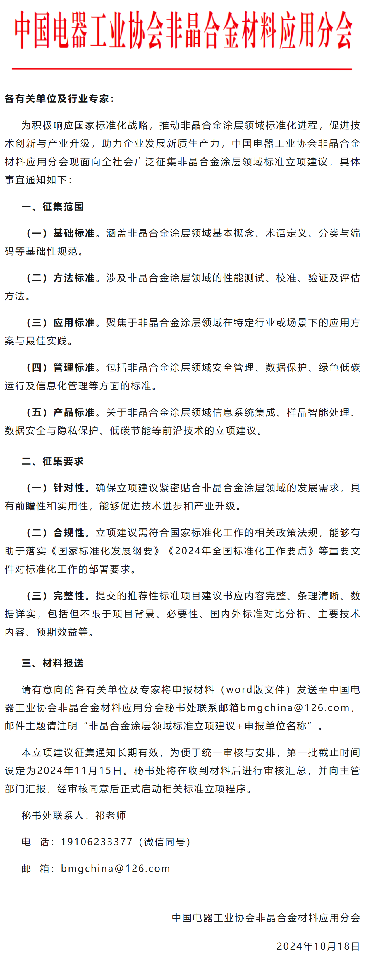 关于公开征集非晶合金涂层领域标准立项建议的通知