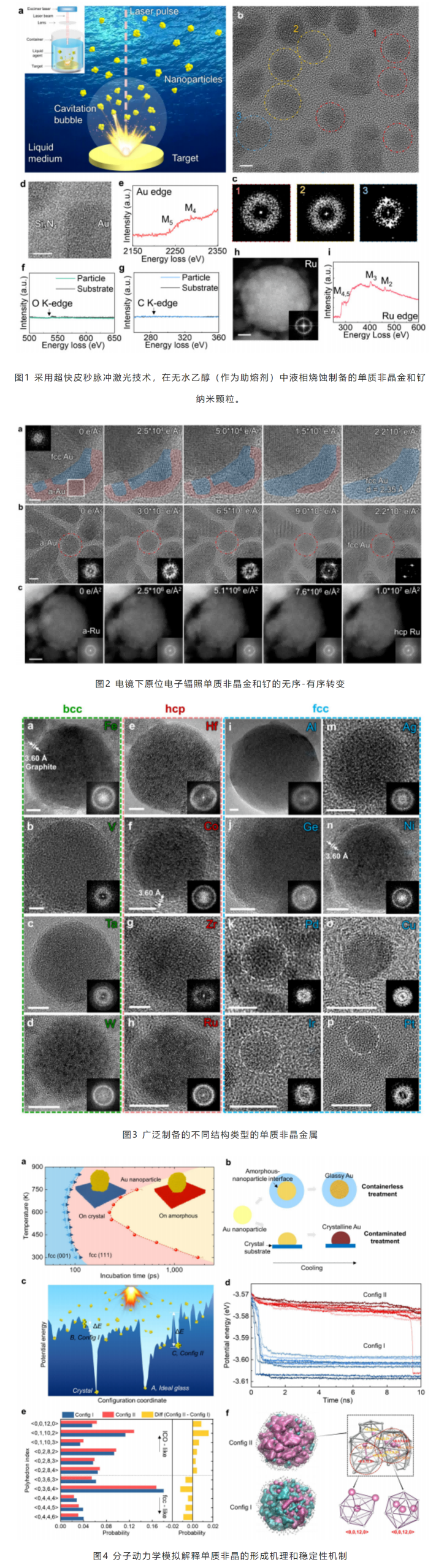 本研究采用超快皮秒脉冲激光技术,在无水乙醇液体介质(作为助熔剂)中对各种单质高纯金属靶材进行液相烧蚀。通过精细调控制备参数,用无水乙醇作为液体保护冷却介质、避免非均匀形核,实现了接近1013Ks-1的快速冷却速率,可成功抑制单质金属晶体的形核和生长过程。由于激光烧蚀这种原子制造方法能够产生大量具有不同能量和构型的颗粒,有可能捕获单质金属能量地形图中的各种不同稳定性的非晶构型,从而使得我们能够筛选到具有室温稳定性的单质非晶纳米颗粒。采用这种技术成功地将各种金属单质纳米颗粒转变成单质非晶态颗粒(见图1)。