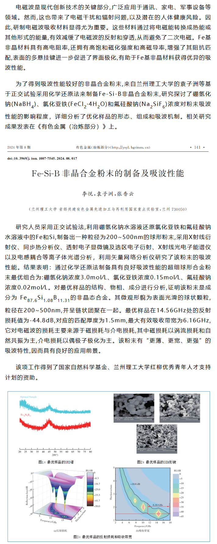 《有色金属(冶炼部分)》袁子洲等工作:Fe-Si-B非晶合金粉末的制备及吸波性能