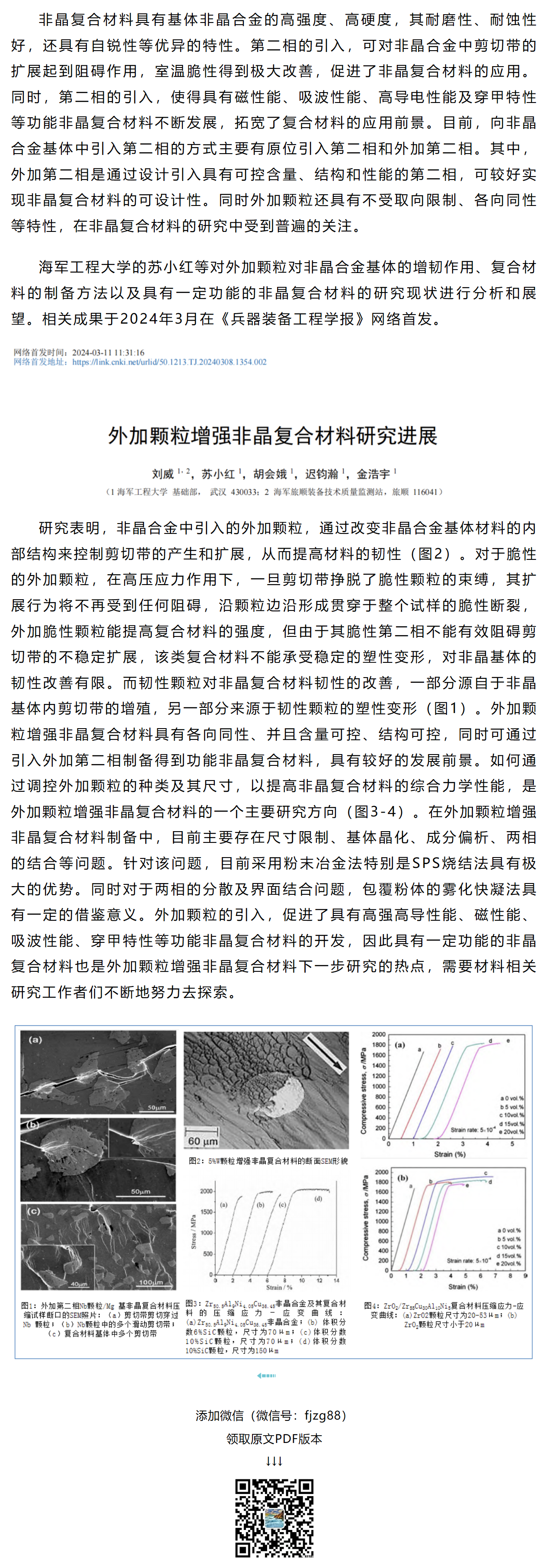 《兵器装备工程学报》苏小红等工作:外加颗粒增强非晶复合材料研究进展