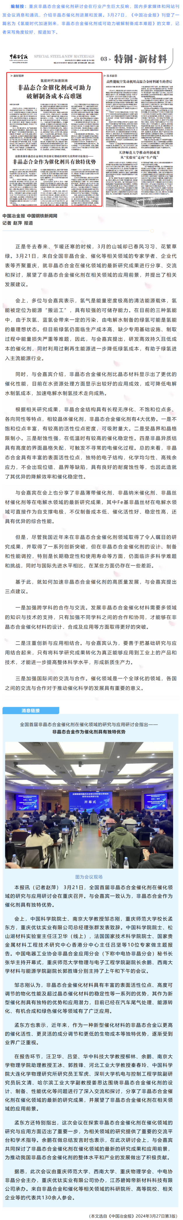 中国冶金报:氢能时代加速到来,非晶态合金催化剂或可助力破解制备成本难题