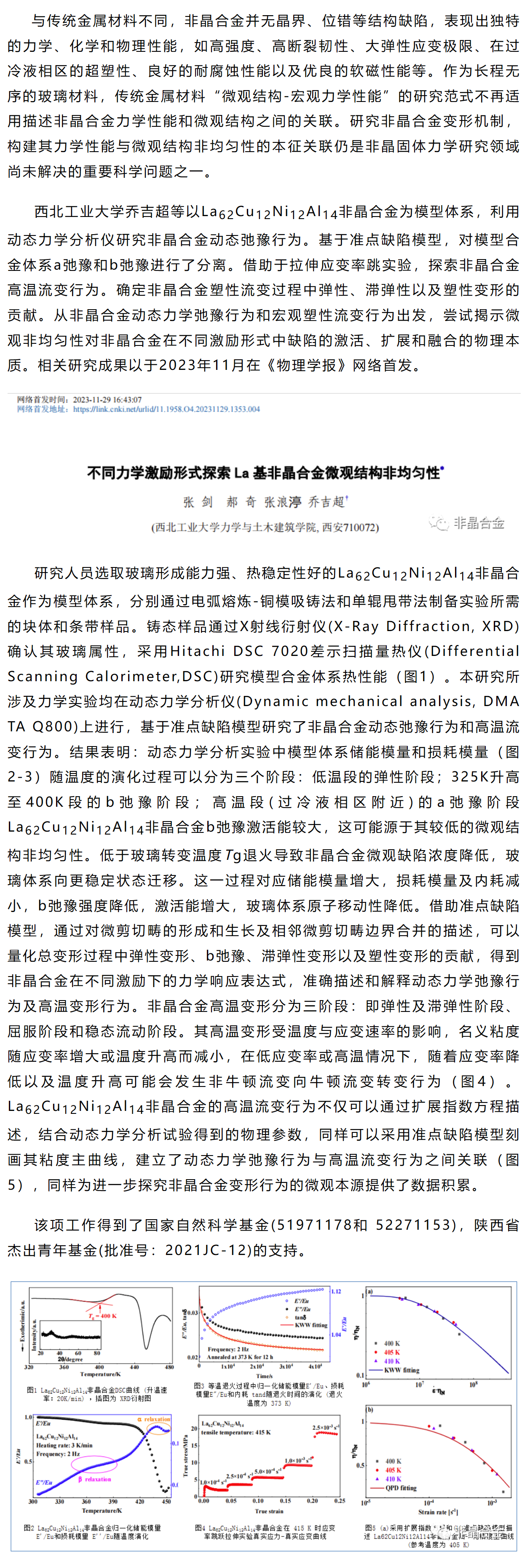《物理学报》乔吉超等工作:不同力学激励形式探索 La 基非晶合金微观结构非均匀性