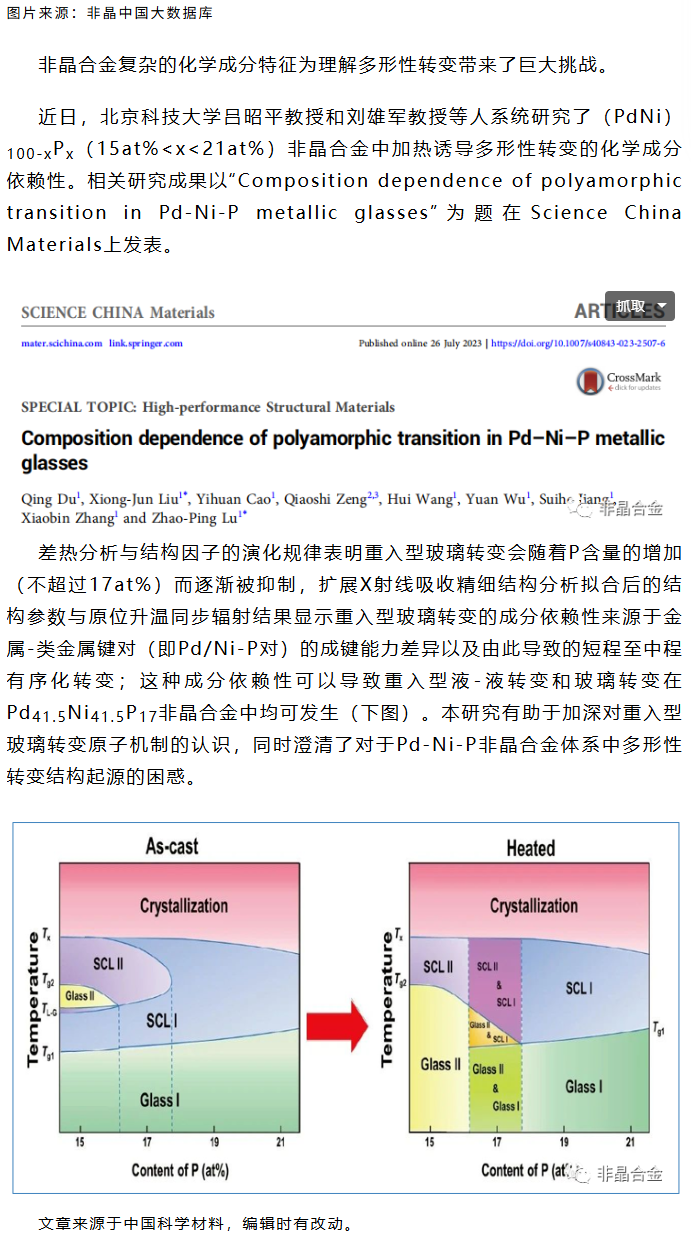 《SCMs》吕昭平、刘雄军等工作:Pd-Ni-P非晶合金多形性转变的成分依赖性