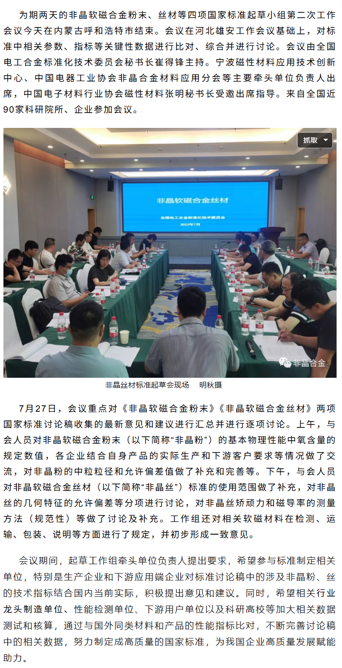 非晶粉末、丝等国家标准起草组第二次工作会议在呼和浩特市召开