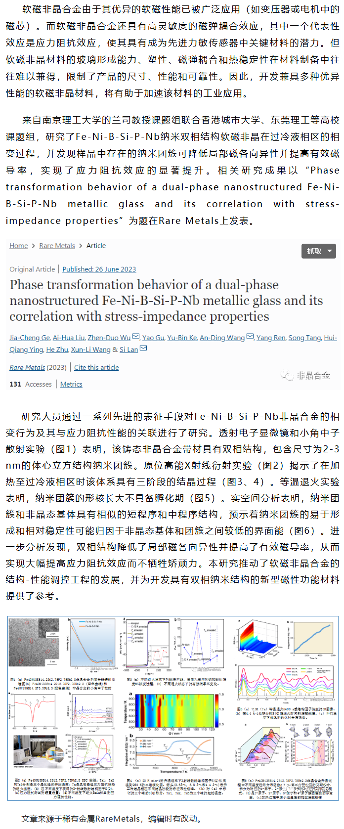 《Rare Metals》兰司等工作:双相纳米结构Fe-Ni-B-Si-P-Nb金属玻璃的相变行为及其与应力阻抗的关联