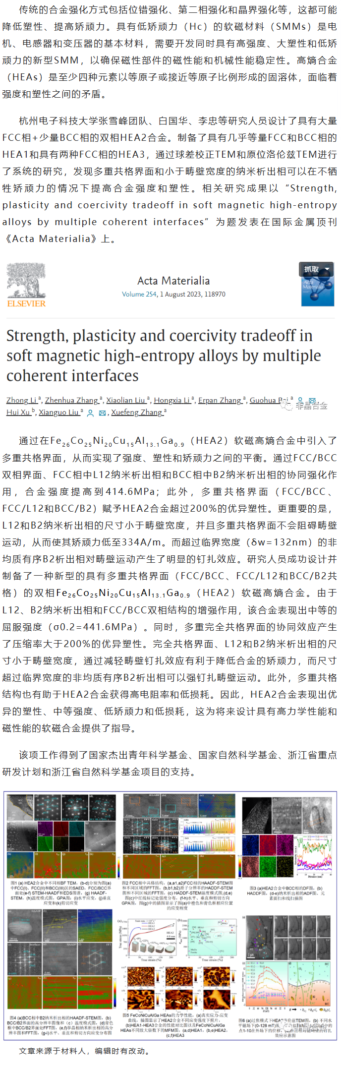 《Acta Mater.》白国华、刘先国等工作:多重共格结构协同提升软磁高熵合金力学性能和磁性能