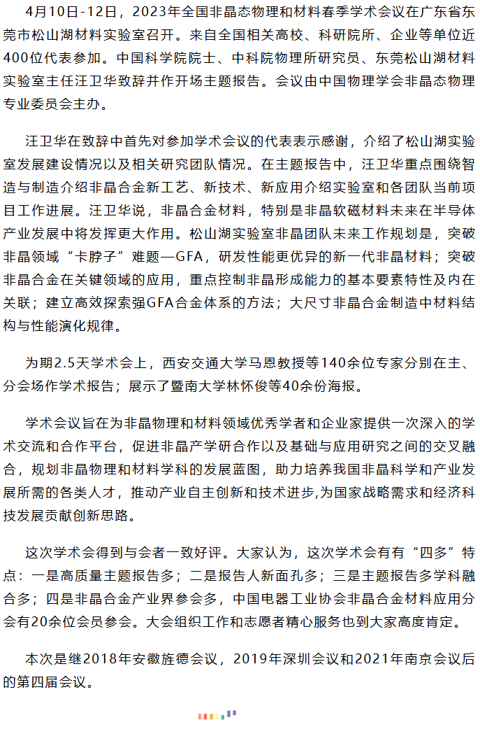 2023年第四届非晶态物理和材料春季学术会议在松山湖召开