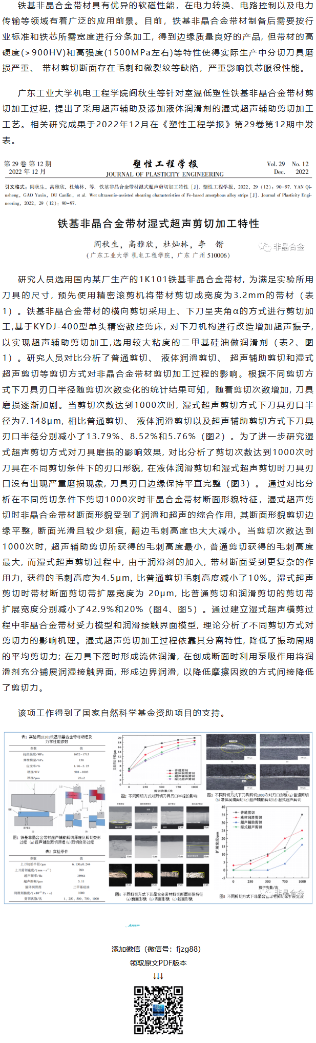 《塑性工程学报》阎秋生等工作:铁基非晶合金带材湿式超声剪切加工特性