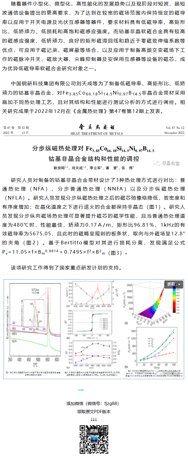 《金属热处理》刘天成等工作:分步纵磁热处理对钴基非晶合金结构和性能的调控