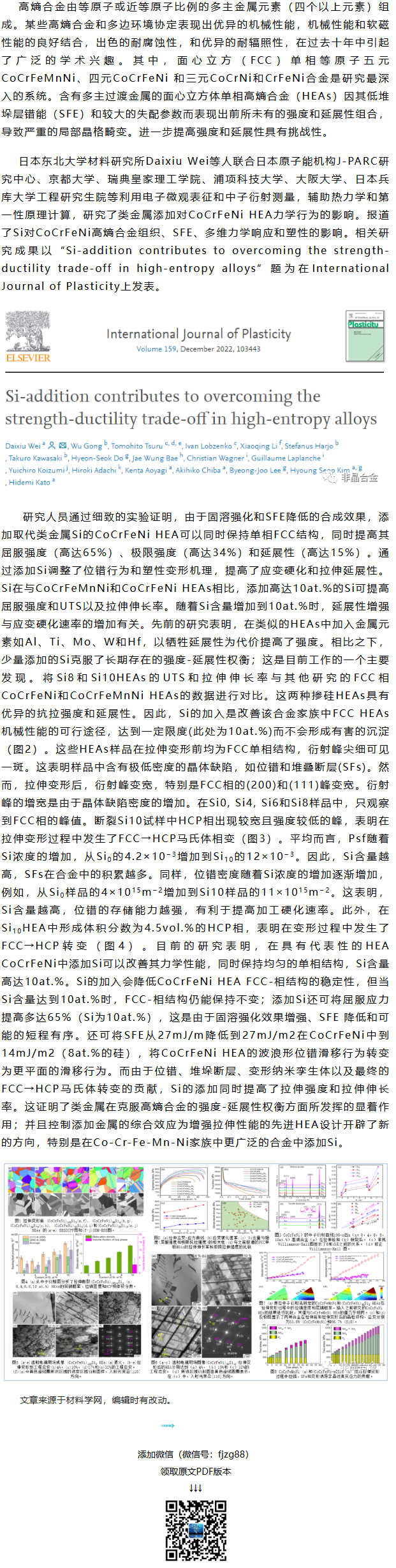 《INT J PLASTICITY》十校联合工作:调整位错和塑性变形机理,克服高熵合金的强度-塑性权衡困境