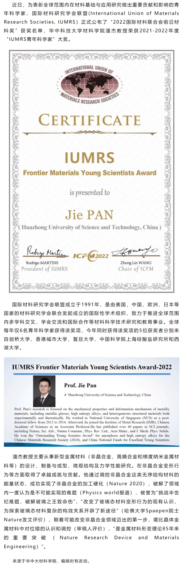潘杰教授荣获“IUMRS前沿材料青年科学家奖”