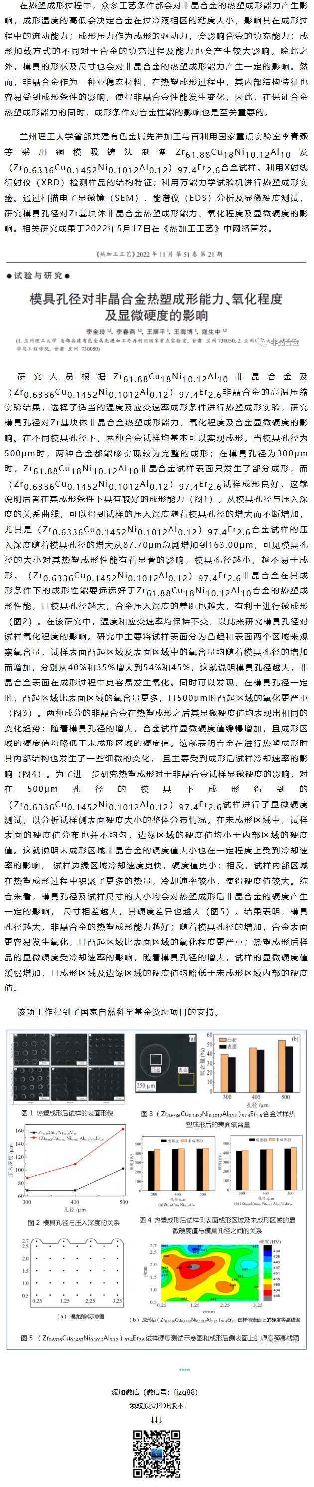 《热加工工艺》李春燕等工作:模具孔径对非晶合金热塑成形能力、氧化程度及显微硬度的影响