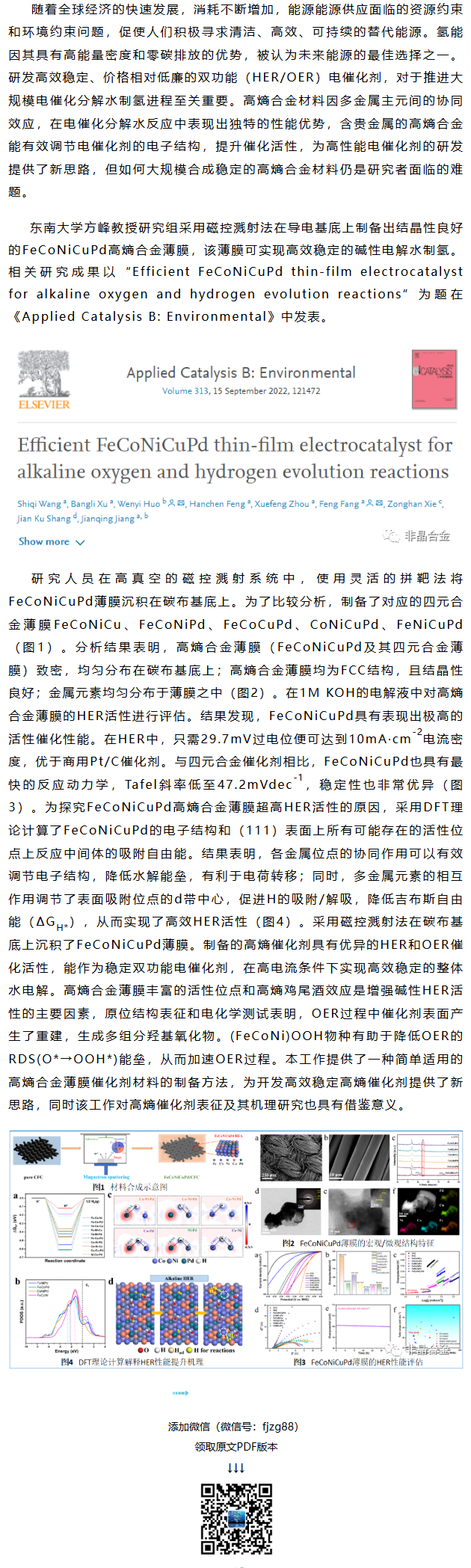 Appl. Catal. B方峰等工作:FeCoNiCuPd高熵合金薄膜实现高效电催化全解水