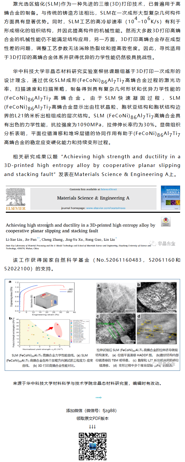 Mater Sci Eng A柳林等工作:利用平面滑移和层错的协同作用实现3D打印高熵合金的高强度和延展性