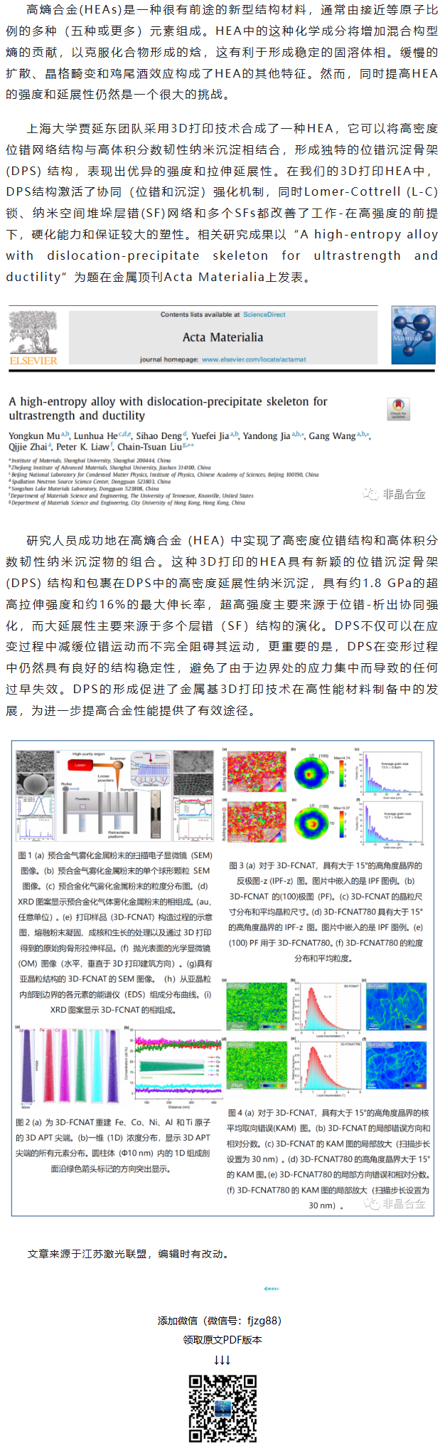 《Acta Materialia》贾延东等工作:3D打印高密度位错和纳米沉淀物协同共存高熵合金