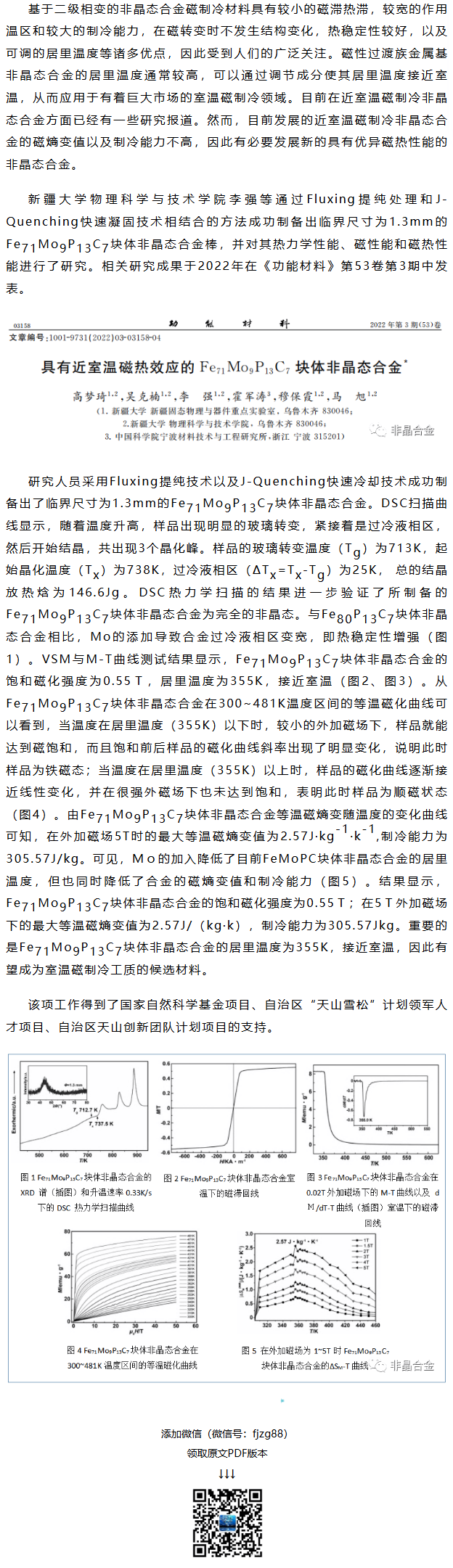 《功能材料》李强等工作:具有近室温磁热效应的Fe71Mo9P13C7块体非晶态合金