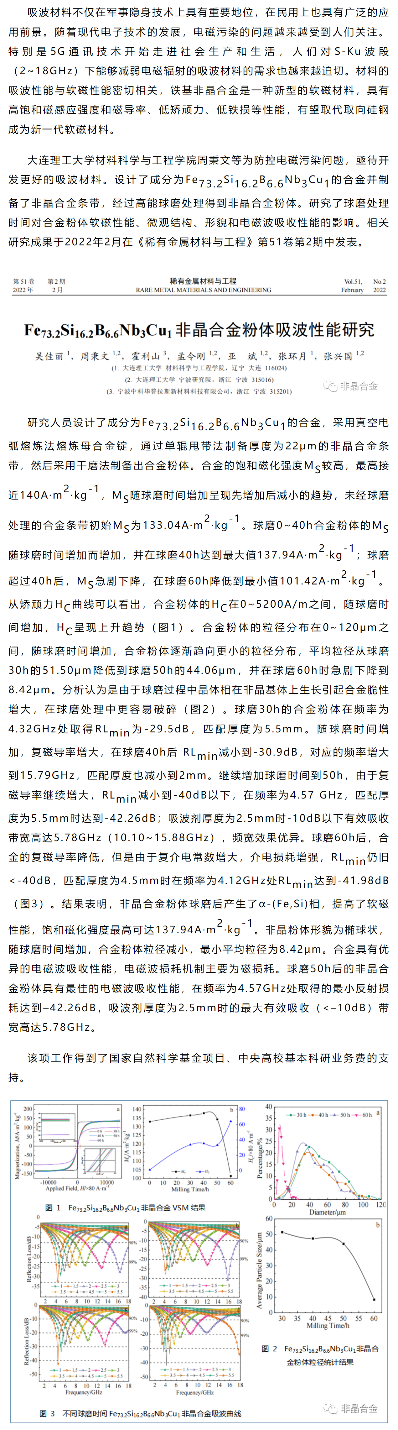 《稀有金属材料与工程》周秉文等工作:一种铁基非晶合金粉体吸波性能研究
