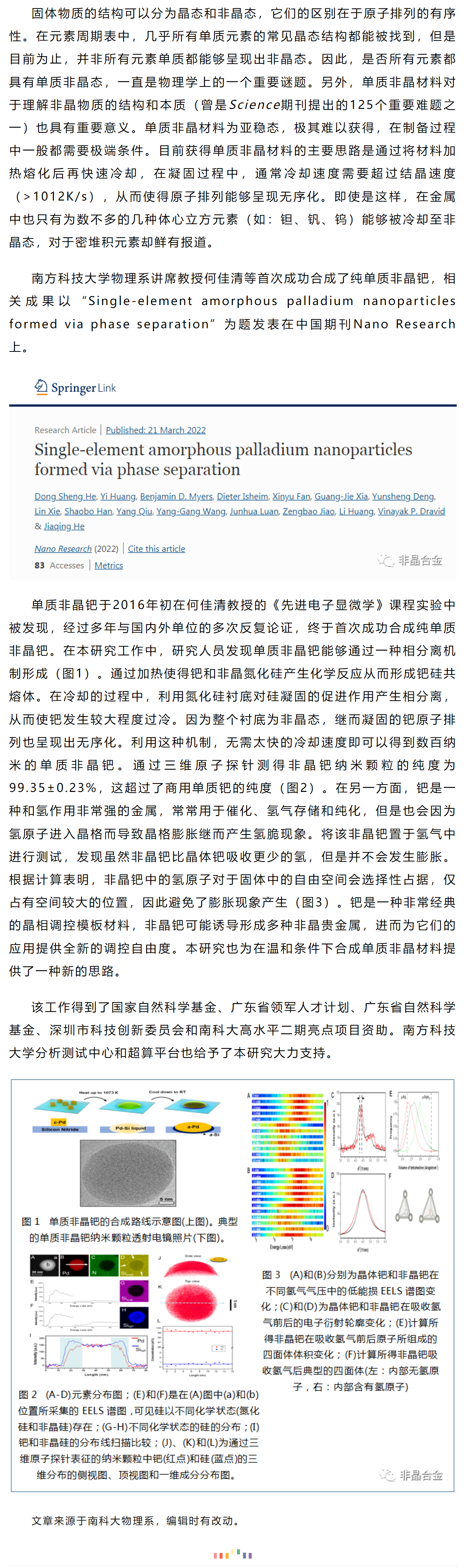 《Nano Resrarch》何佳清等工作:首次成功合成纯单质非晶钯