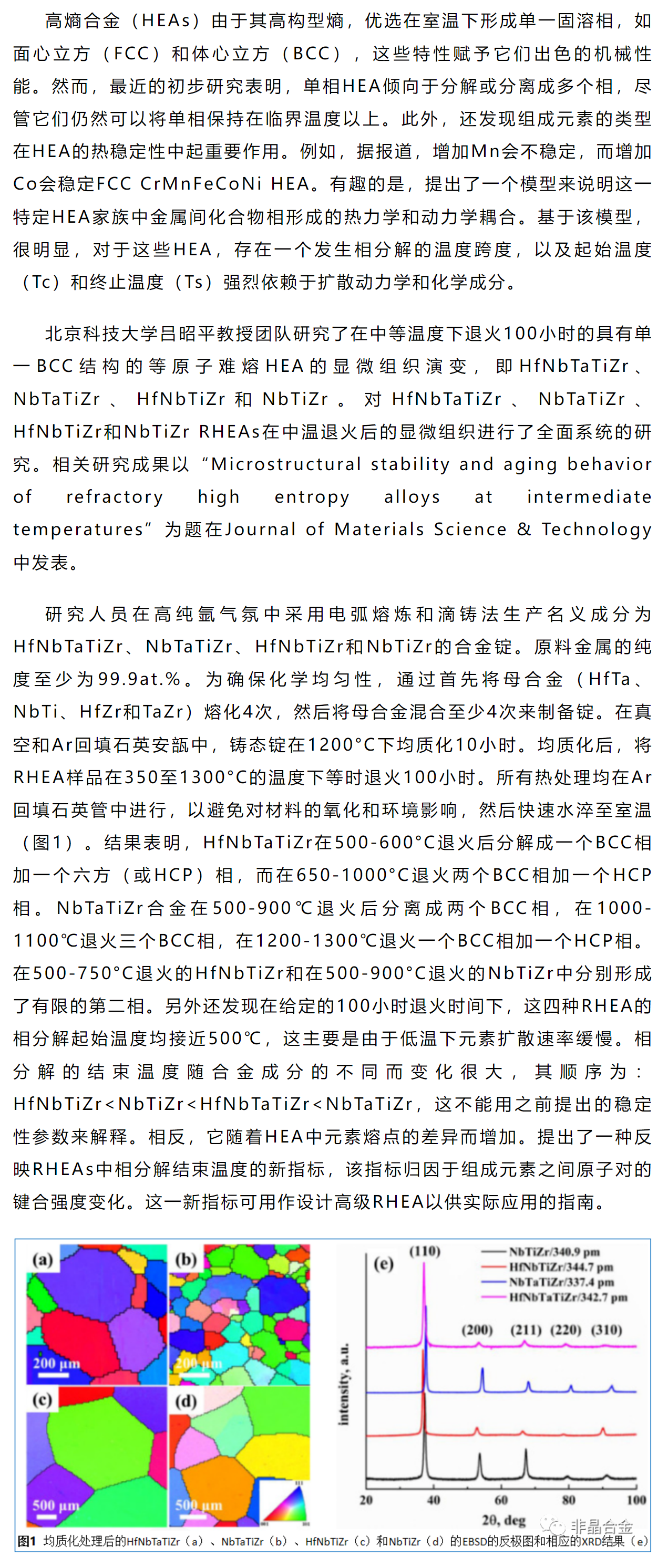 J MATER SCI TECHNOL吕昭平等工作:高温难熔高熵合金的组织稳定性及中温时效行为