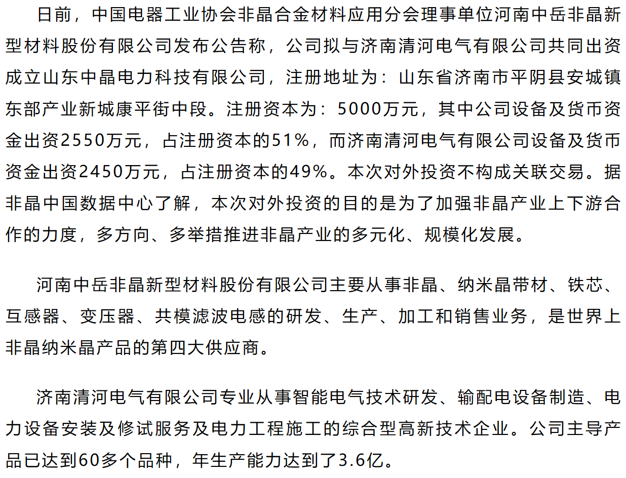中岳非晶拟投资2550万设立山东中晶电力科技有限公司
