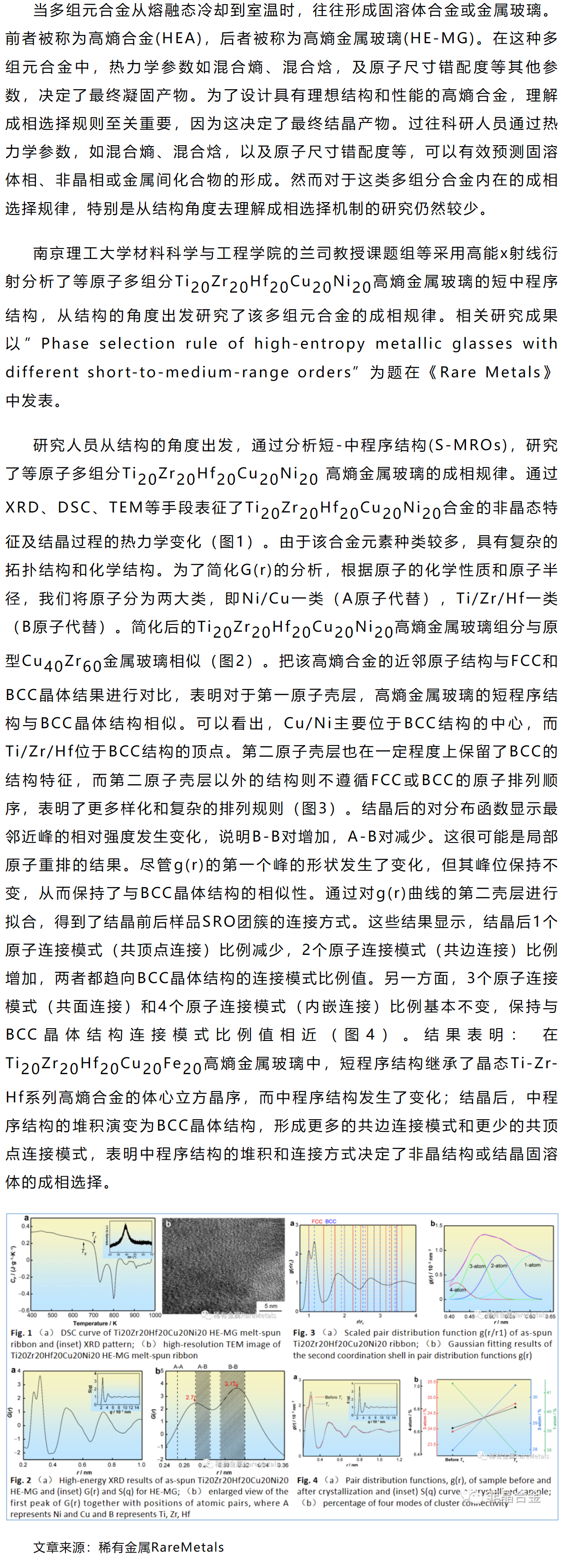 《Rare Metals》兰司等工作: 短-中程序结构对高熵金属玻璃相形成规律的影响