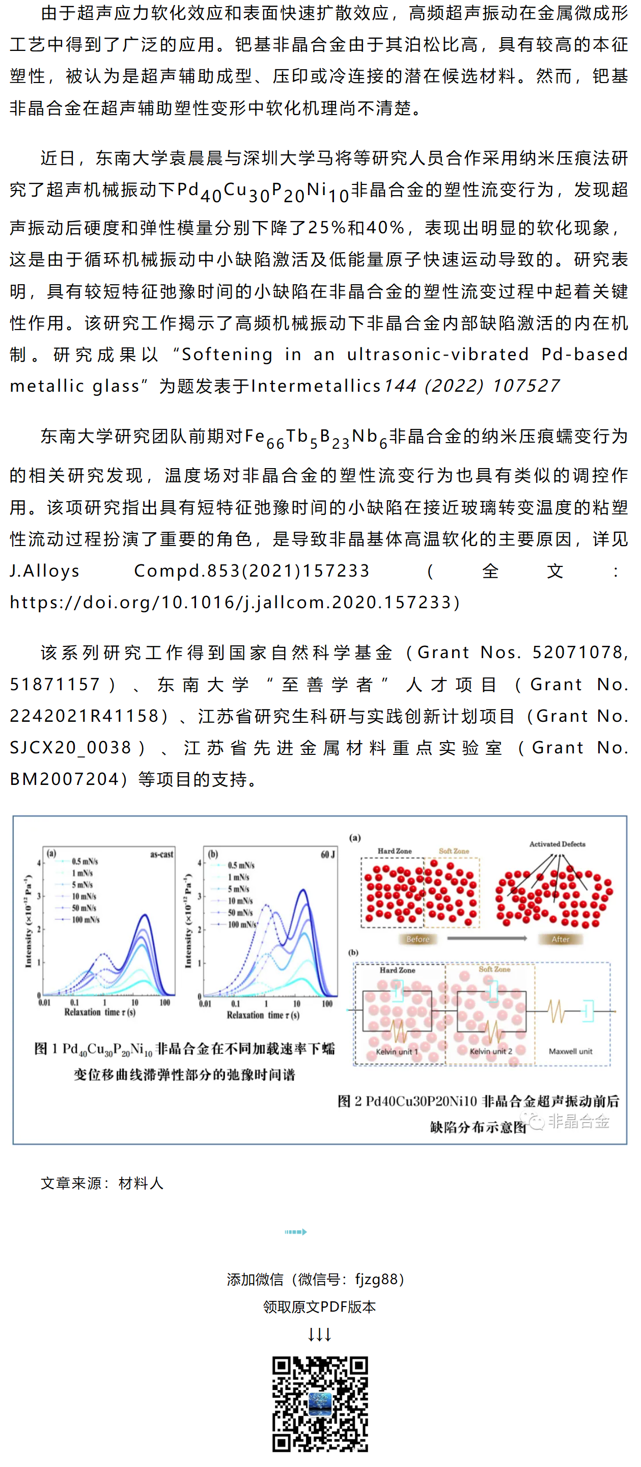 《Intermetallics》袁晨晨等工作:钯基非晶合金在超声振动下的软化流变行为