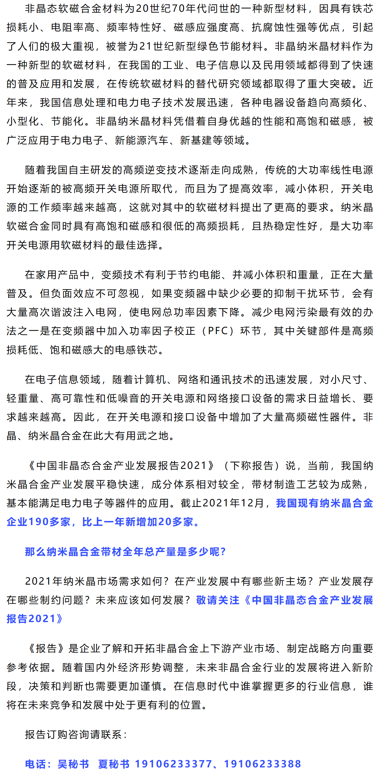 产业报告:全国190家企业,去年生产了多少吨纳米晶合金软磁材料?这个材料还能做吗
