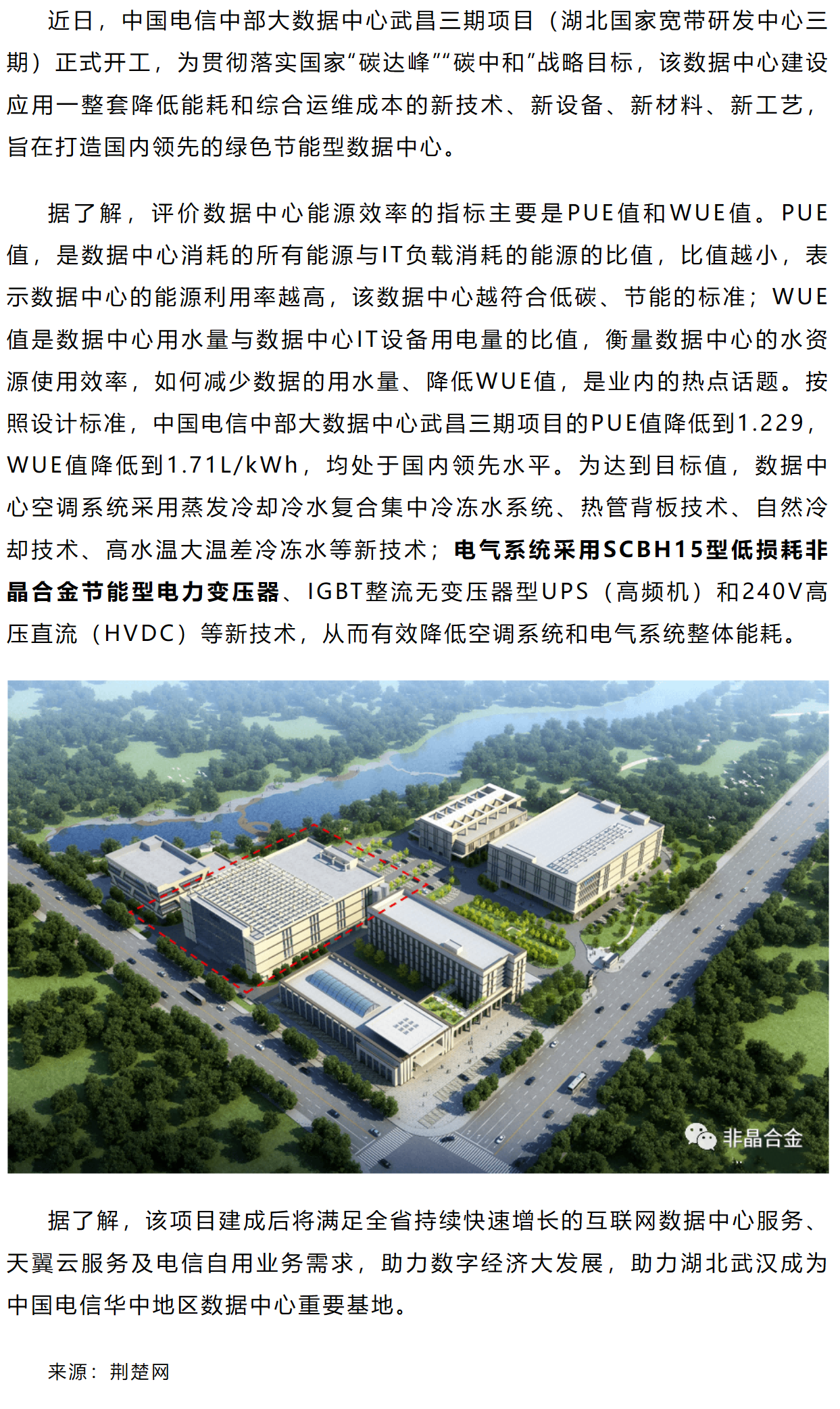 让非晶变压器赋能!中国电信中部大数据中心武昌项目建设绿色节能型数据中心