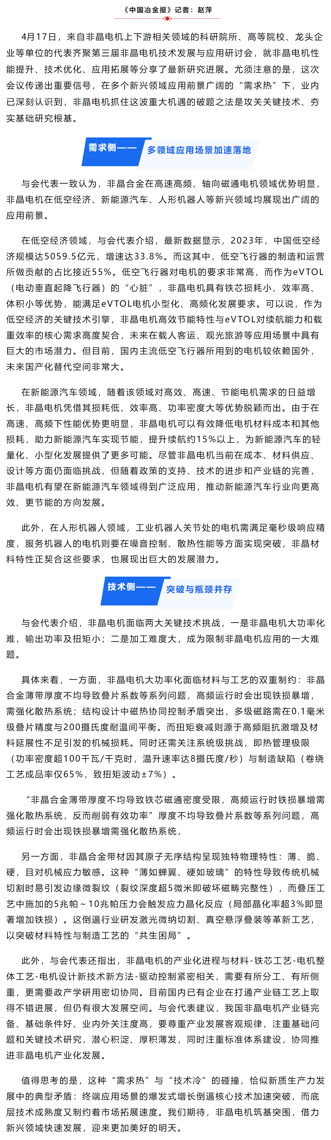 中国冶金报:“需求热”碰撞“技术冷” 非晶电机迎来筑基突围关键期