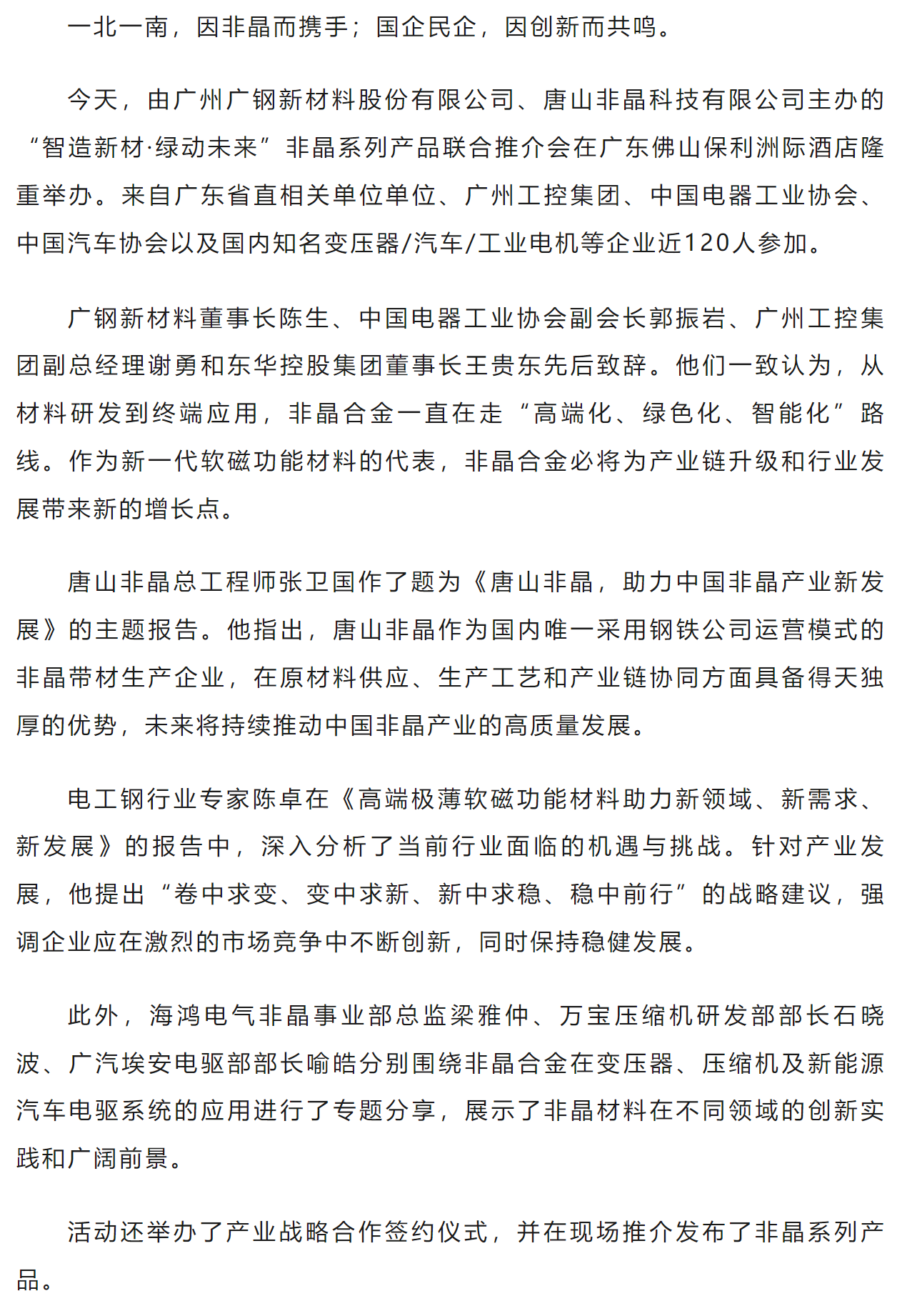 “智造新材 绿动未来”广州广钢等非晶系列产品联合推介会在佛山召开