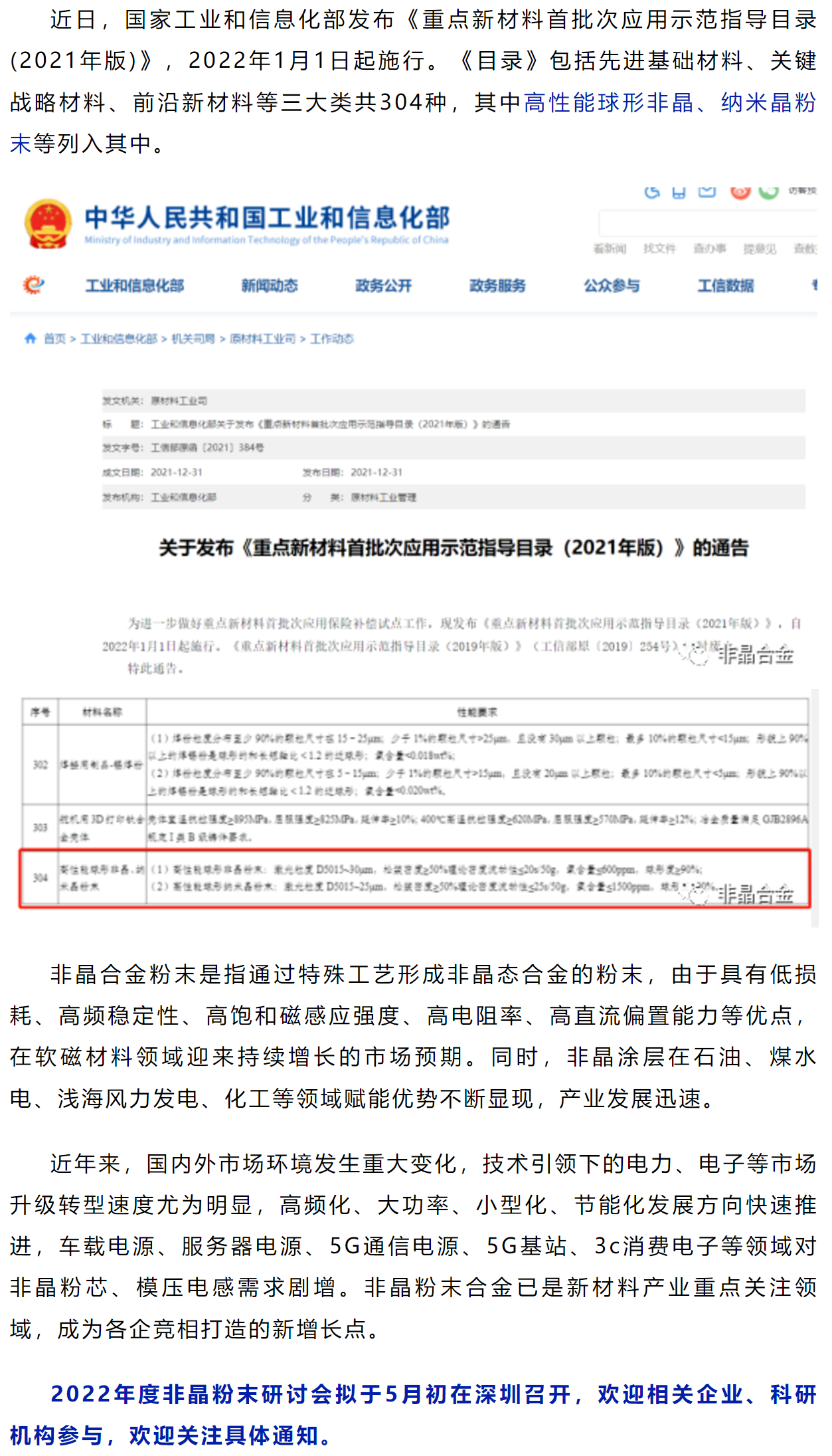 工信部印发《重点新材料首批次应用示范指导目录(2021年版)》非晶合金粉末入列