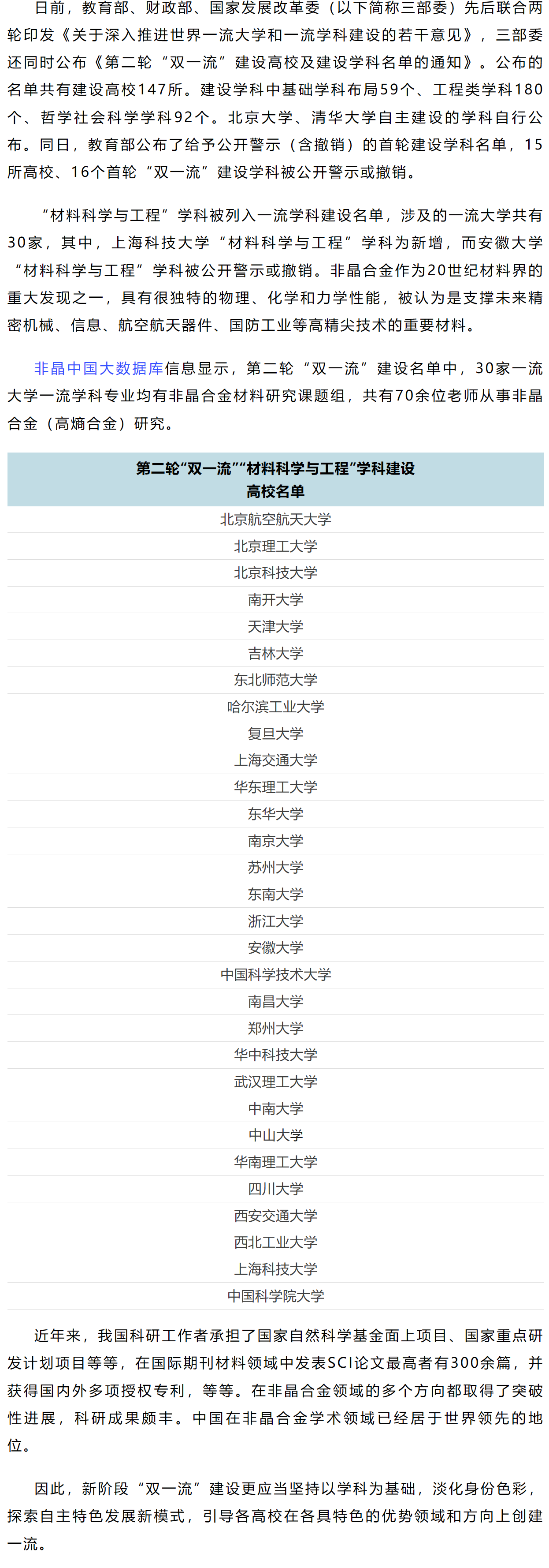 第二轮“双一流”名单公布 ,30家高校的非晶合金等材料均成为一流学科建设