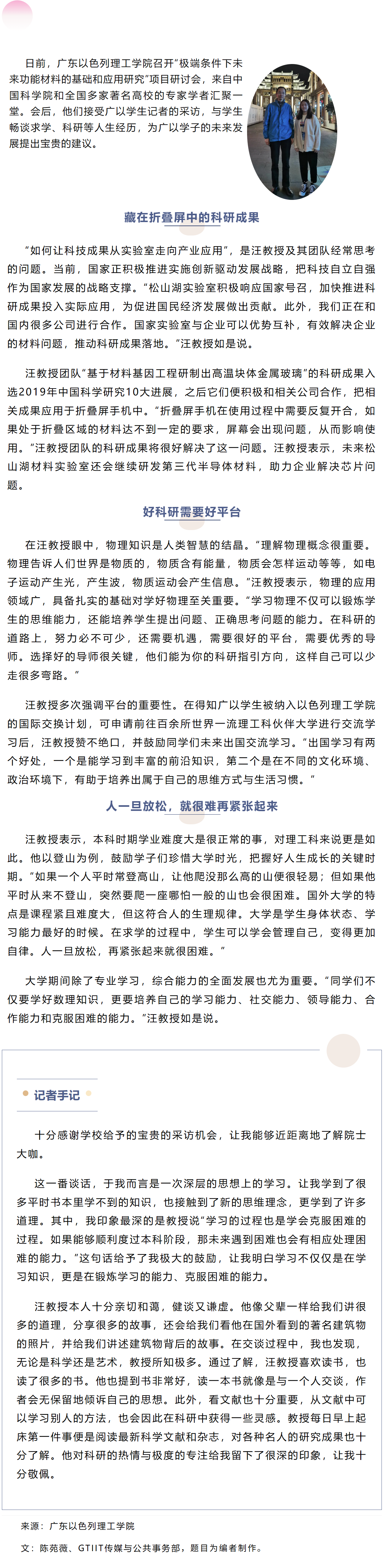 陈苑薇同学与“大咖“面对面:汪卫华院士——折叠屏背后的科研专家
