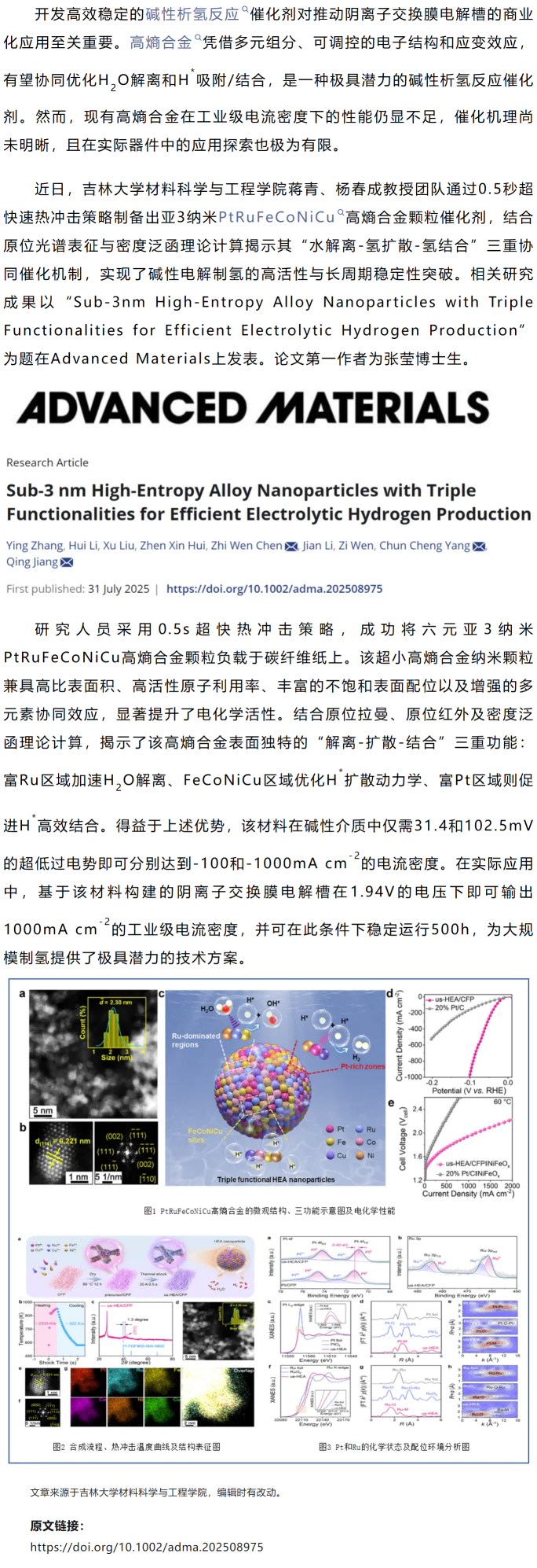Adv. Mater.|吉大蒋青杨春成等工作:亚3纳米高熵合金颗粒助力高效电解水制氢
