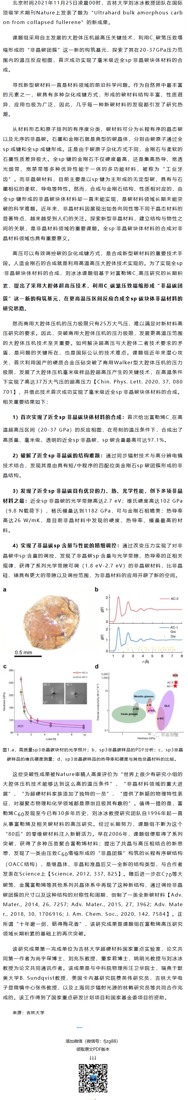 《Nature》刘冰冰等工作:高压技术突破,合成出极硬非晶碳!