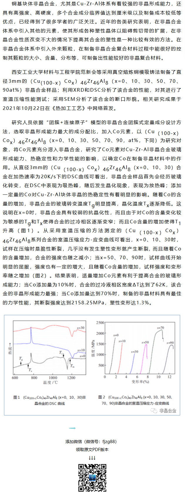 《热加工工艺》范新会等工作:Co添加对Cu-Zr-Al基非晶合金玻璃形成能力和力学性能的影响