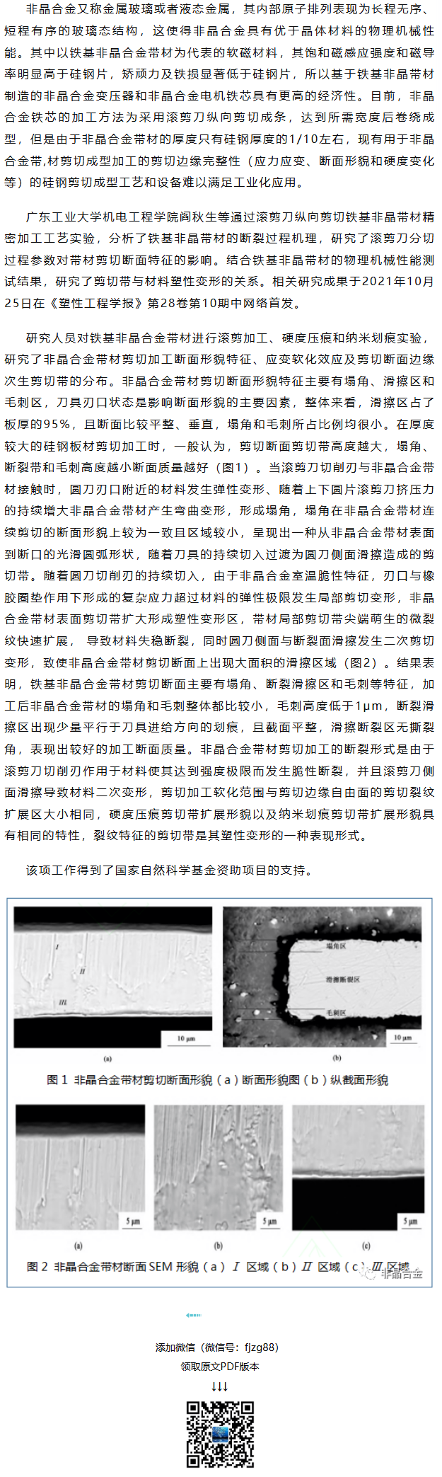 《塑性工程学报》阎秋生等工作:铁基非晶合金带材剪切加工特性