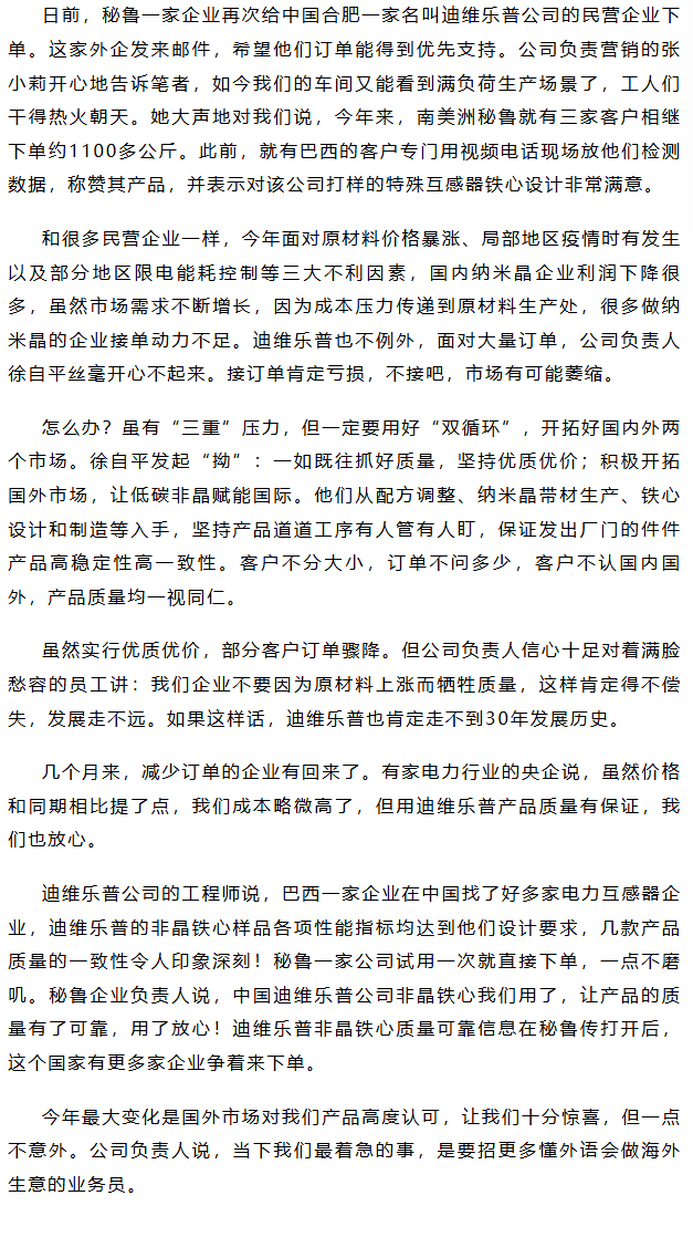 秘鲁:中国迪维乐普公司生产的非晶电力互感器铁心我们用了才放心