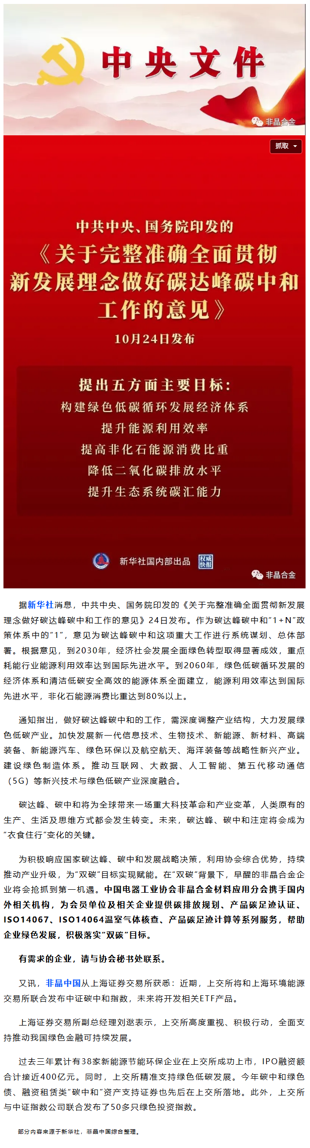 中央层面总体部署亮相!“双碳”重要性凸现 非晶合金新材料机会多多