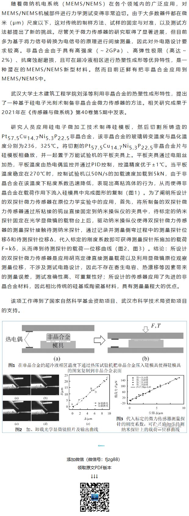 《传感器与微系统》刘泽等工作:非晶合金微力传感器
