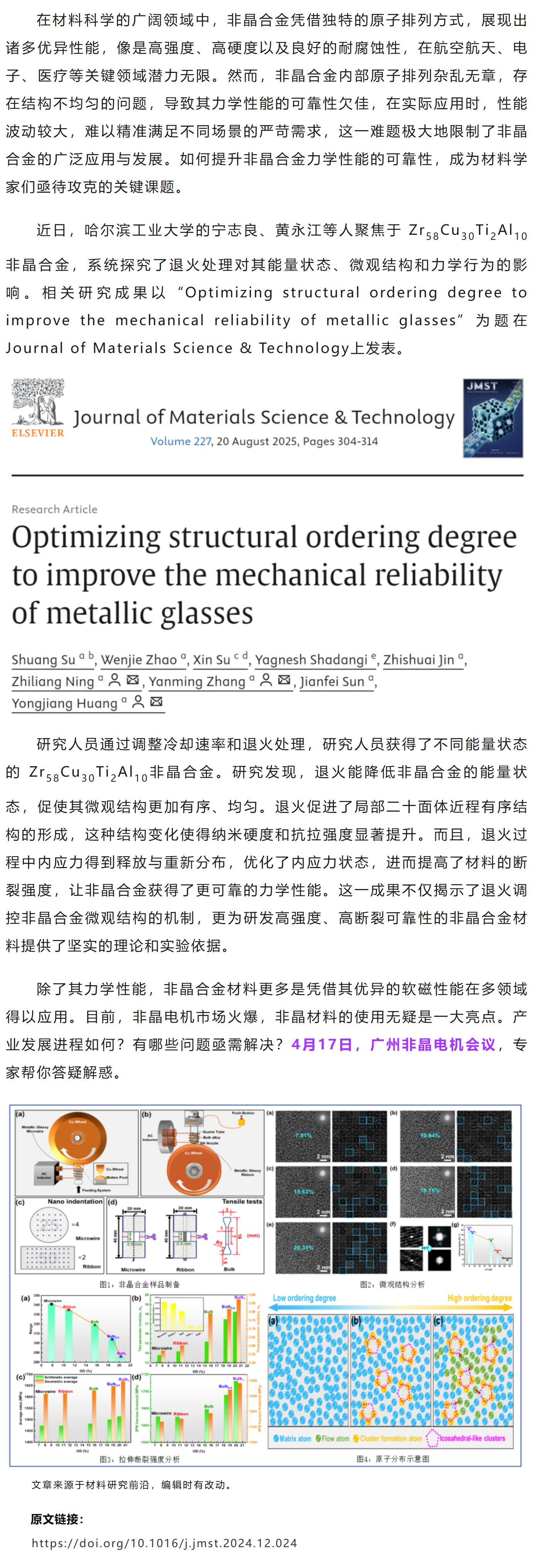 JMST哈工大黄永江等工作:优化结构有序度以提高金属玻璃的力学可靠性
