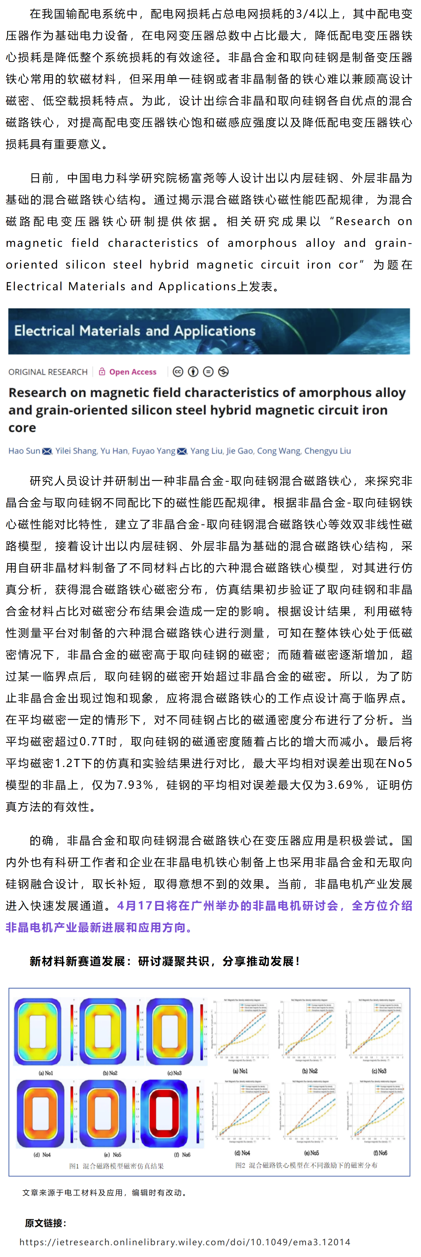 EMA电科院杨富尧等工作:非晶合金-取向硅钢混合磁路铁心磁场特性研究