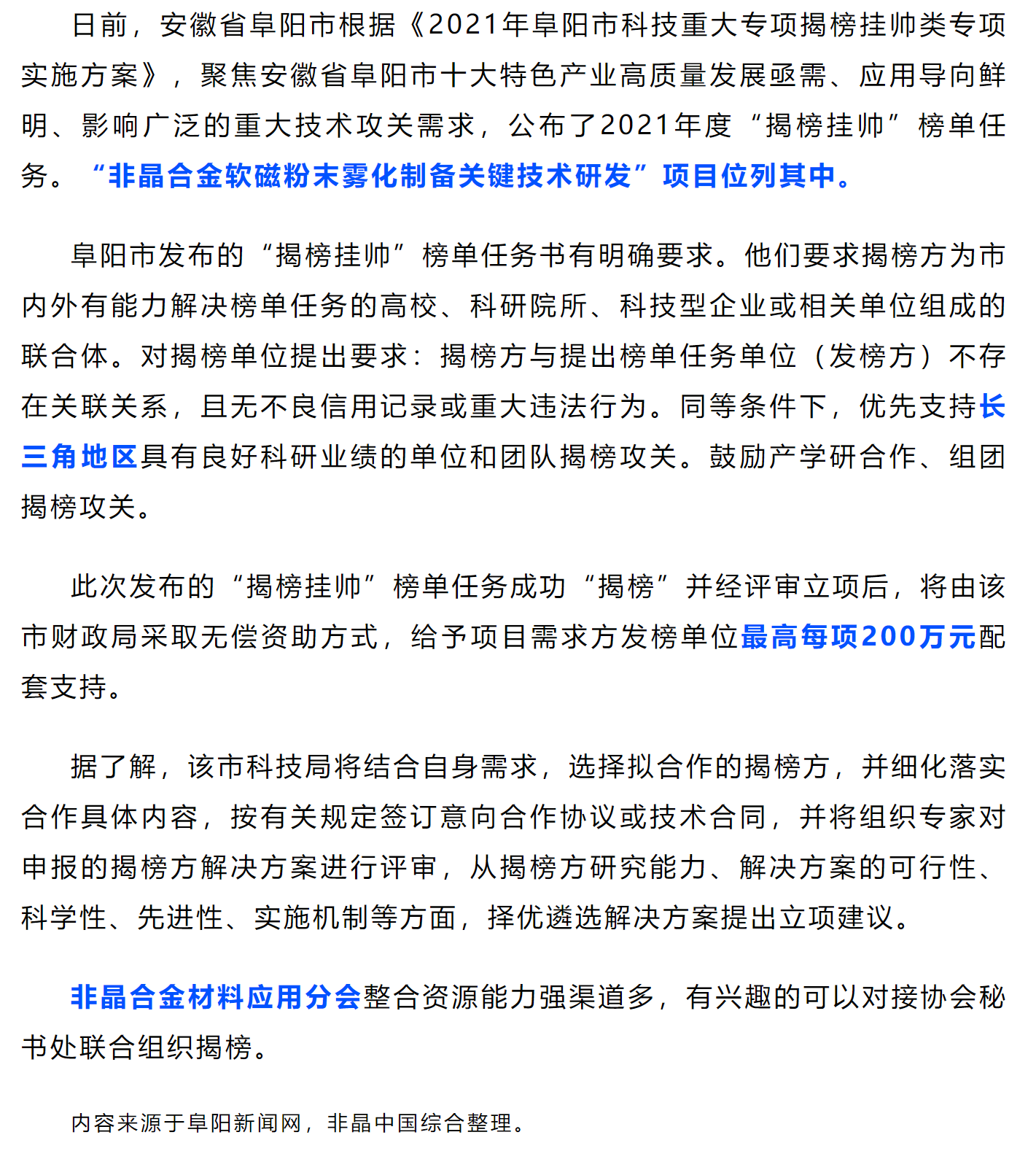 又有“揭榜挂帅”啦!安徽阜阳两百万招募非晶合金软磁粉末雾化制备关键技术研发者