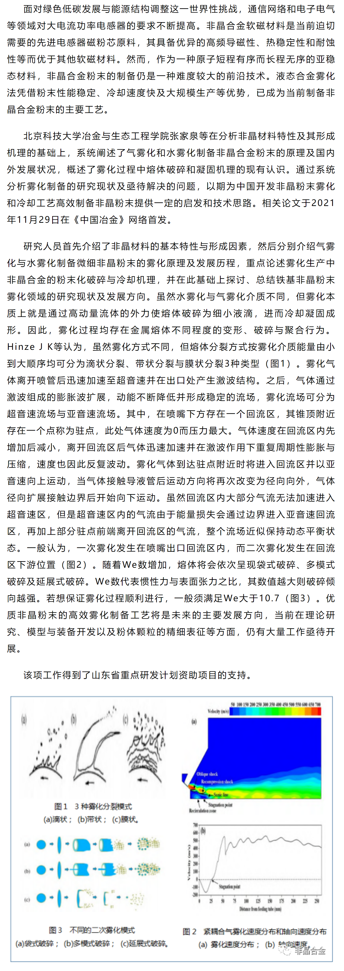 《中国冶金》张家泉等工作:液态金属雾化成形及非晶合金制粉的研究进展